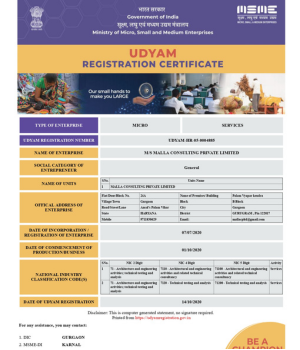 We are registered with Government of India, Ministry of Micro, Small and Medium Enterprises (MSME), Udyam Registration no. UDYAM-HR- 050004885 Dated 14.10.2020